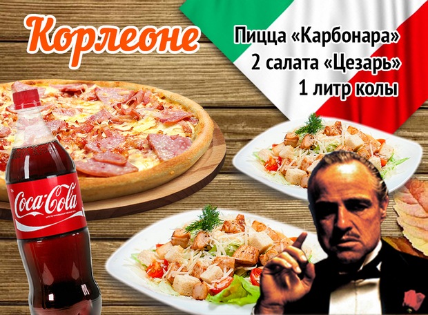 Пицца "Карбонара" 33 см, две порции салата "Цезарь" и литр колы.