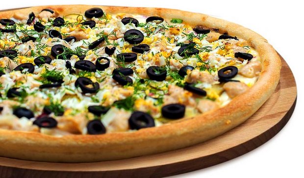 Пицца соус, моцарелла, пицца соус сливочный, чеснок, красный лук, маринованные огурцы, помидор, филе куриное, огурец